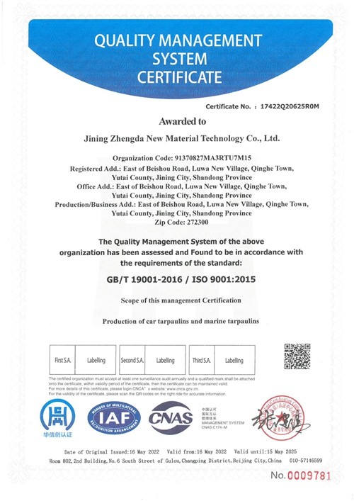 济宁政大新材料科技有限公司,成立于2020年,位于山东省济宁市,公司专业生产加工各种高端PE面料篷布,十余年的生产研发经验,拥有专业的研发团队和质检团队。