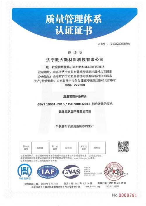 济宁政大新材料科技有限公司,成立于2020年,位于山东省济宁市,公司专业生产加工各种高端PE面料篷布,十余年的生产研发经验,拥有专业的研发团队和质检团队。